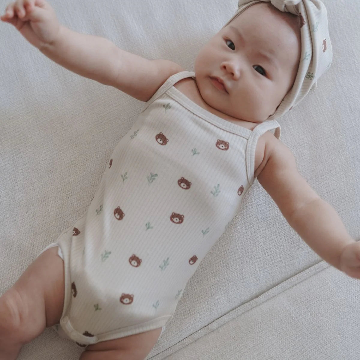 A soft, breathable baby romper crafted from a premium blend of certified TENCEL™ Modal and organic cotton, designed to be gentle on delicate skin. Featuring a lightweight sleeveless style and easy-change snap closures at the crotch, this romper keeps your little one cool, comfy, and free to move. Adorned with an adorable Woodland Bear print, it’s perfect for warm days and everyday play.