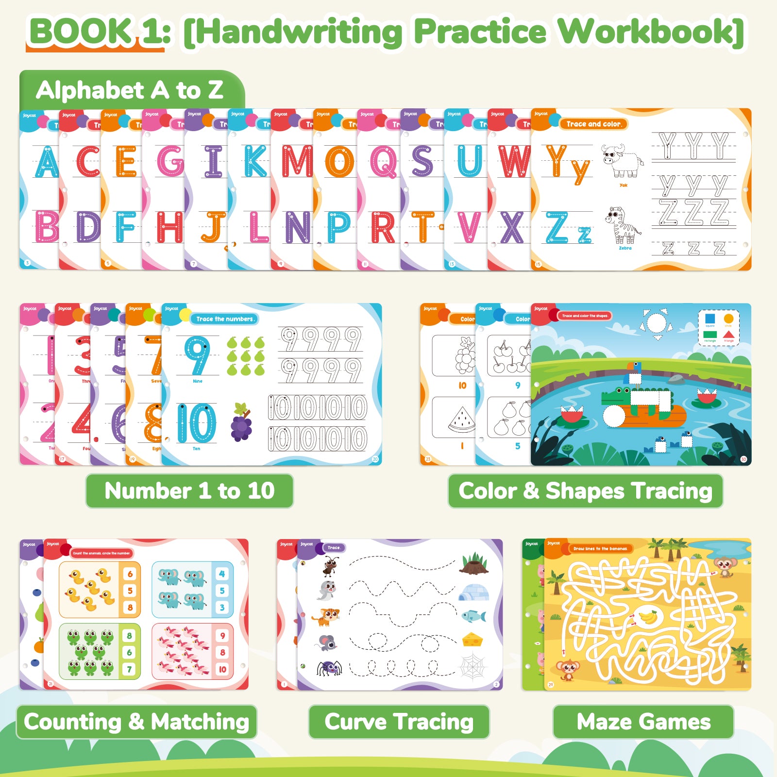 The first learning book for kids: JoyCat preschool learning activities book covers all the essential writing letters and numbers. Bright colors and fun games keep your child's full attention away from electronics. Great for early educational cognitive development, reading and comprehension, concentration and attention focus, writing, and hand-eye coordination. (Includes children with autism and language delays)