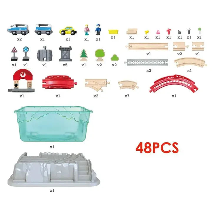 - The train set comes with a city-themed storage box and rocky cover lid that forms part of the rails and the scenery with their embossed tracks. Pack everything inside neat and easy storage